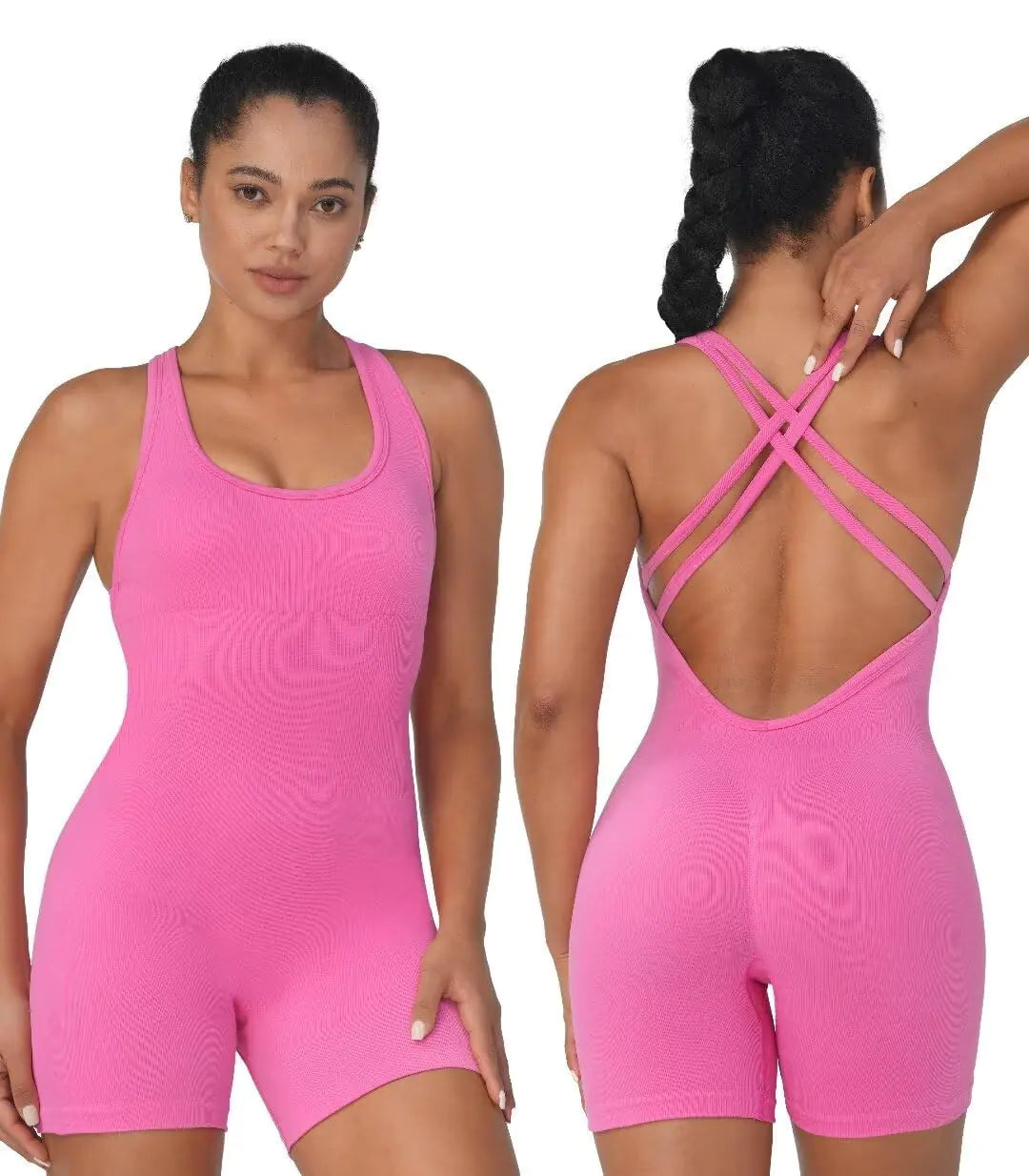 Sunzel Womens Backless Romper Scrunch Butt Shorts Seamless Jumpsuits Bodycon Workout Unitard Bodysuit built in Bra 5" Hot Pink Medium